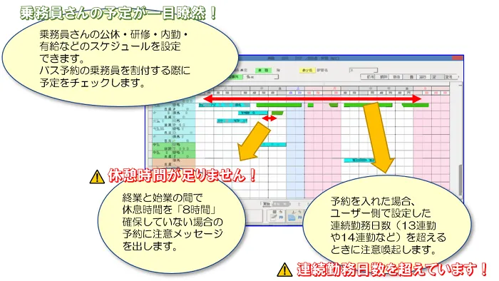 13連勤チェック、休息時間の8時間チェック、乗務員の公休・研修日などといった予定入力を線引き画面に設定することにより、一目で乗務員のスケジュールを確認可能です。
