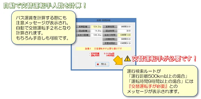 「運行コース作成機能」では、バスルートの走行距離・走行時間を自動検索しますが、「交替運転者の配置基準」による運転距離や運転時間を超える場合には、『交替運転手が必要』との注意メッセージが表示されます。